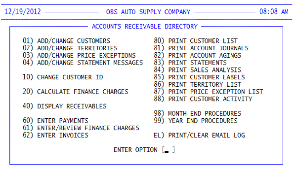 Software systems for retailers ![]() | Home | Overview | Inventory | Receivables | Sales Processing | Payables | Purchasing | Payroll | Accounting | Testimonials | Contact Us | : ![]() ![]() ![]() ![]() ![]() Accounts Receivable : obs, obsinfotech, obs information technologies, obs management system, accounts receivable page![]() ![]() ![]() ![]() ![]() ![]() ![]() ![]() Hover mouse over for more information. ![]() ![]() Please Contact Us for more information about the OBS Management System or to schedule an on-line demonstration. |